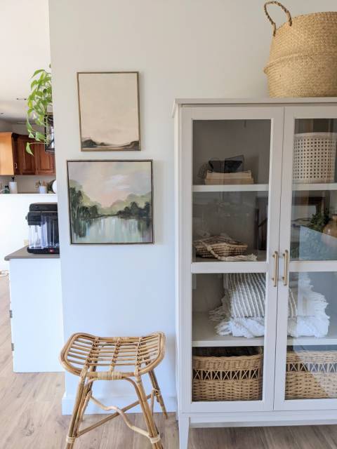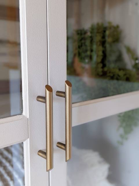 Spontaneously I would hop on google to do some "glass cabinet" shopping, and one evening the perfect one popped up that we could easily purchase through Home Depot. The original color of the cabinet was ivory with bronze/gold brushed handles, I knew that needed to change right away! I envisioned a space with a little pop of color to make it extra cozy and not feel so blah.