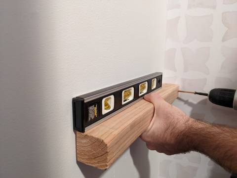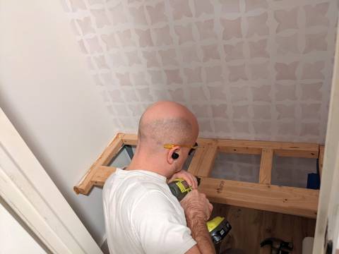 First, we applied the wall paper. Then built the frame for the shelf with 2x4 boards, applied top of shelf with another board and finished off with a 1x4 board on the the front to complete a clean look for the shelf.
