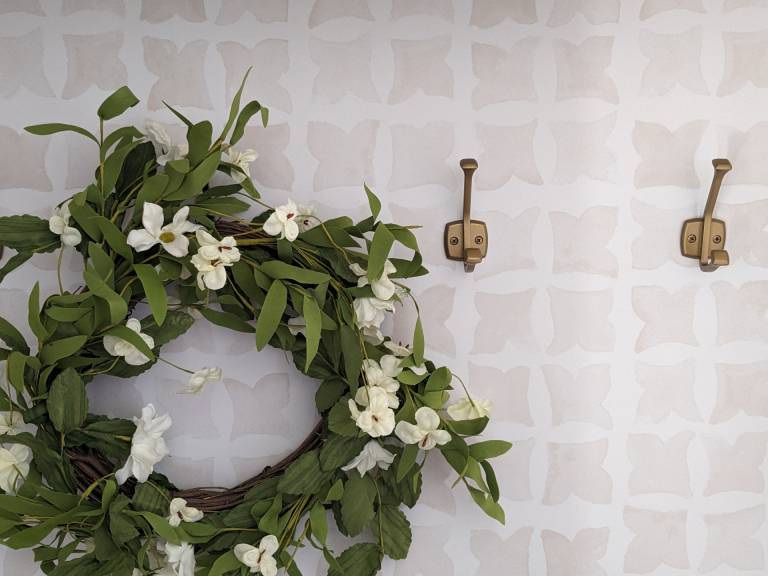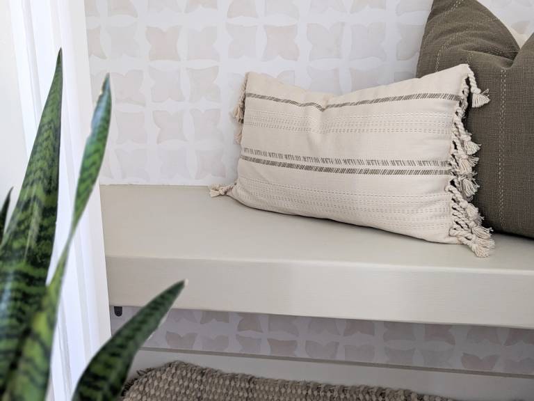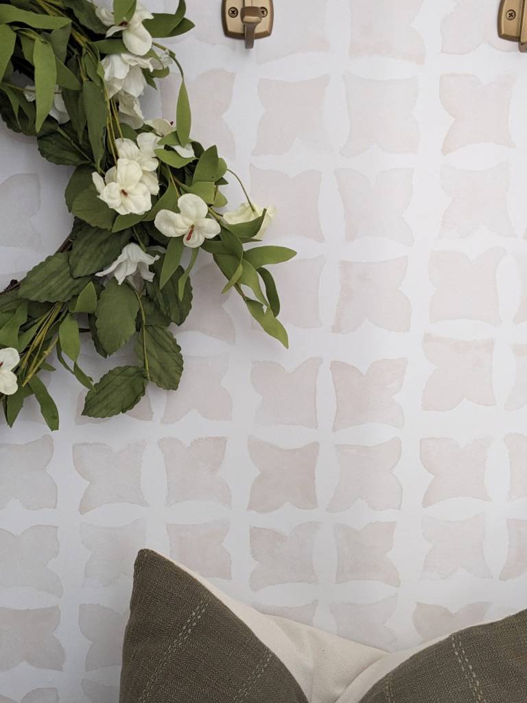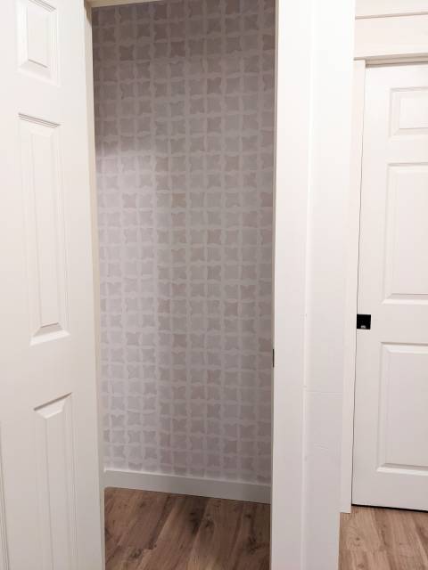 We purchased this peel and stick wall paper from Esty! It was super easy to put on and is even more beautiful in person from what we saw online! It's a simple, clean and neutral design that easily flows with our flooring and bright white walls.