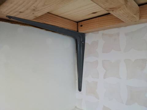 We also built the frame of bench with 2x4's. While we were building the base for the bench we ran into a problem... There were no studs on the side walls, and so we knew there wouldn't be the strength needed to support items, or sitting, or even just in general the weight of the shelf itself being solid wood. So we had to get a little creative!
