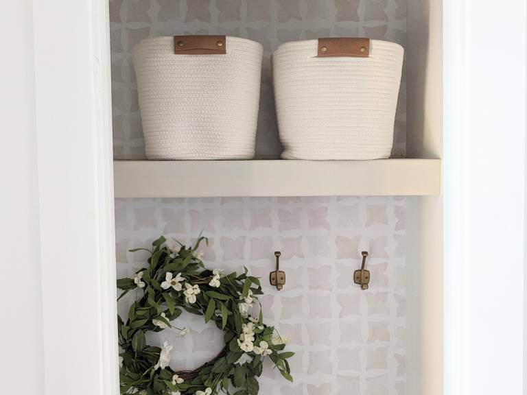 Our front entry coat closet just needed some TLC, because it was just plain old boring! It had one of those typical white-wire shelfs and that was it...