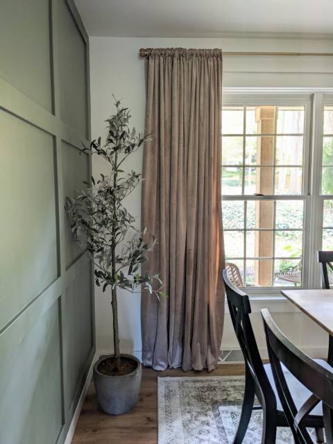 Last but not least, the final touch was adding the curtains! We found these curtains on Amazon for a super reasonable price!! Because of the custom trim we needed to go with longer drapes (so we could fixate the curtain rod closer to the ceiling), You would never know but we placed pins and adjusted our curtain height to our liking!