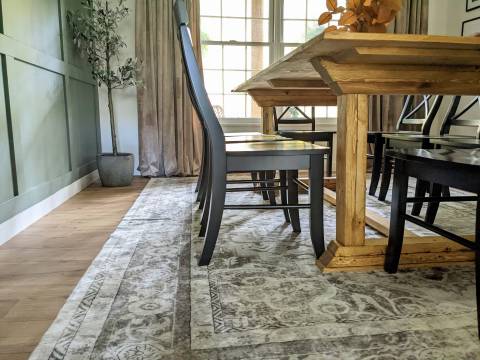 We decided to build our dining room table because everything is/was so insanely priced and we did not want to wait months on end to receive our table. So we had found a blogger who made the same table (that we absolutely loved as soon as we saw it) with a whole detailed report of what we needed, and how she made it etc. We love how this table fits in the room! We bought a few extra chairs to fill around the table from wayfair, and for a reasonable price. And let's quick talk about this rug, it's washable and super soft!! Win, Win! (I'm sorry there is no longer a link) There are a ton of options out there, I highly recommend!