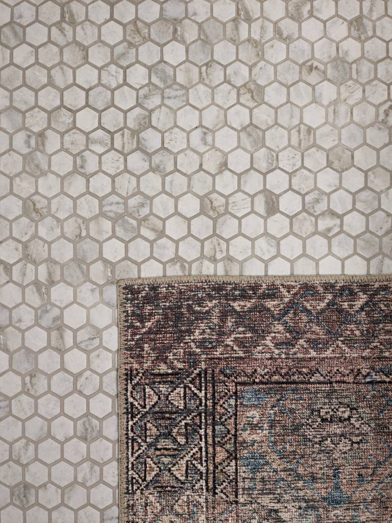 Talk about choices, choices with tile! We ended up narrowing it down to a large hexagon tile and a mosaic hexagon tile (along with the $$). I am SO glad we chose this Allen & Roth mosaic tile!! It looks so so good in the space! The color is technically Greige, it has a mix of tiles that have whitish/grey color and then streaks of a light rich brown which flows flawlessly with the maple vanity!