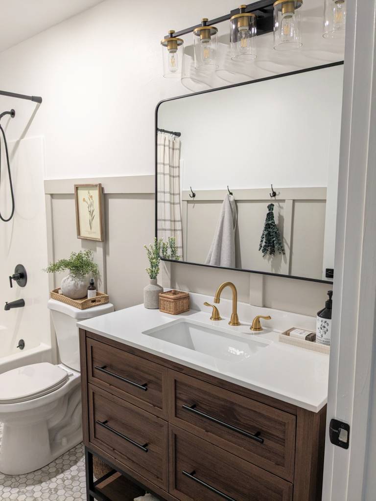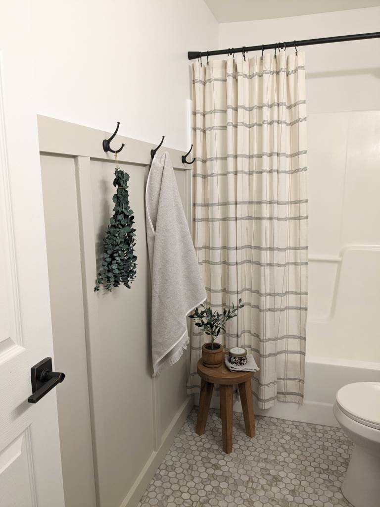 Before we got to adding the finishing touch (vanity), we first added some board and batten for the towel wall but also behind the vanity! I just love how some accents can make a whole space feel :) We painted the board and batten in accessible beige by SW. This color has been a keeper in our home! For something different, we put board and batten on both sides of the bathroom, and I am so glad we did! It adds not only sturdiness for the hooks, but also adds more dimension to the two big white walls, I especially love the maple vanity sitting against the color, it really pops!