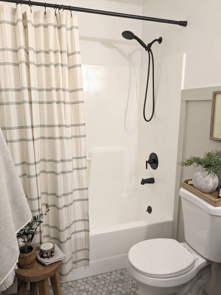 As you can see, it was a pretty basic and neutral bathroom, but needed an update. There were a good bit of things that were going to need replaced anyhow such as toilet hardware due to corrosion and lots of wear and tear over time. So we made a list to help us focus on what we wanted as the outcome but be sure we didn't miss any of the essentials.