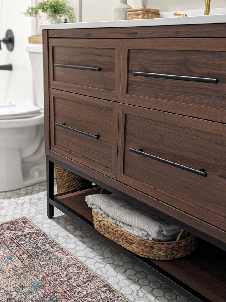 We wanted to go with a little bit of a smaller vanity because the previous vanity was custom sized to the space, pretty much maxed out as much as they could. BUT, it took up most of the space on that wall and made it very tight around the toilet area and honestly made it so there wasn't as much room to move around in the bathroom.