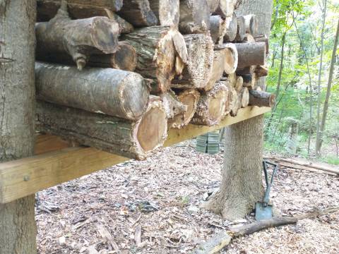 Next, to the right hand side we added logs to frame out the mulch area, then adding playground mulch. Talk about a workout.... We got 3 loads of mulch, and shall you ask how we did that? Thank goodness for our 4-wheeler! We shoveled the mulch from our driveway into big garbage bags, stacked them on the ATV and dumped into area... like 10 times! As you can see, there is also a firewood holder that Pete built for a place to keep the wood off the ground. It was super easy to make, he simply used (2) 2x4's which were bolted into each tree.