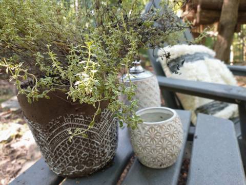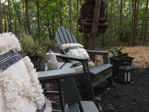 The finishing touches were adding Adirondack chairs with a side table, some plants and lighting décor! I found a good selection of plants from home depot, and a cute set of citronella candles/tikis from ACE hardware! The planters I already had at home, but I did go spray paint happy on them!