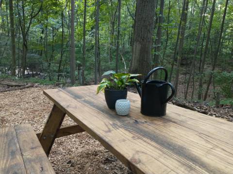 We thought it'd be so fun to add an area for extra seating, eating, playing games etc. So we found a picnic table through Lowe's which we put together, then stained and put a protective coating on so that it will be long lasting.