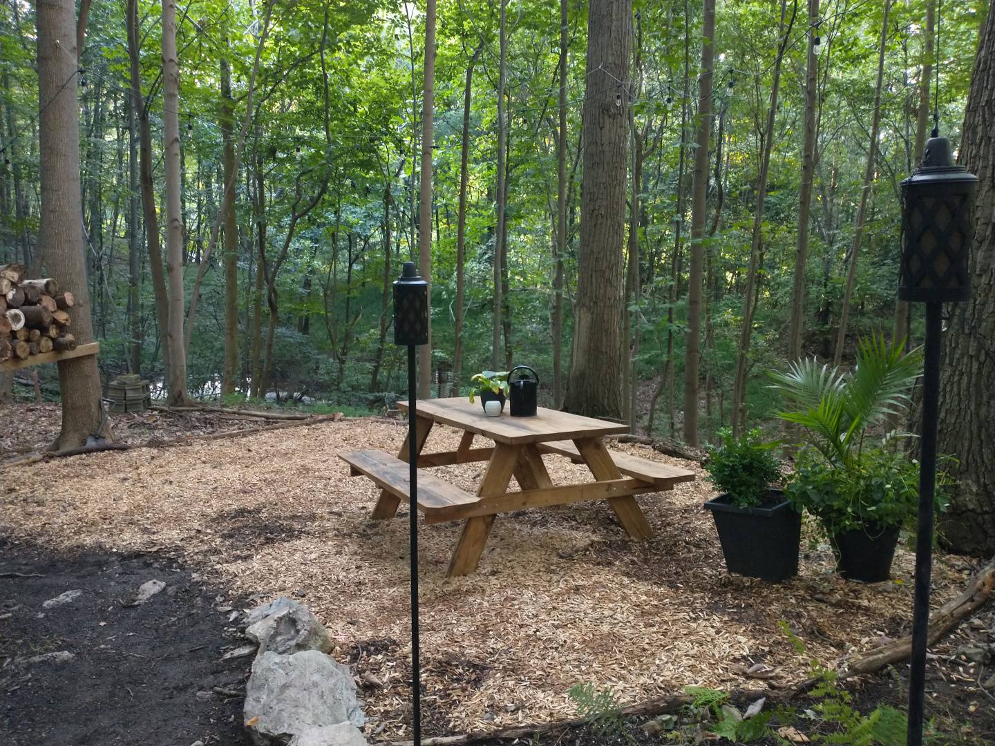 While Peter was working on the picnic table, I decided to transplant what felt like a thousand ferns and add them to each side of the entryway! Though it sucked getting poison ivy from wondering around in the weeds, it was totally worth the end result! We then also added tiki torches along the entry pathway, which made a world of a difference as it not only added fantastic ambiance, but it felt so much more inviting to the whole area!