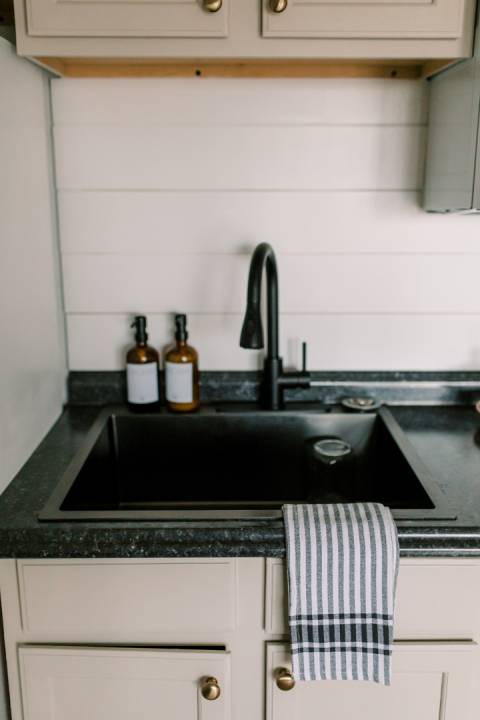 For the countertop, we had originally bought a laminate sheet to cover the existing one with so we didn't have to go and get a whole new countertop. Fast forward we cut it to size, placed it down and it just didn't lay as nice as we hoped nor did the seams match perfectly and we didn't have a good way to be able to do that without going out and getting more expensive tools than we already had on hand. We hopped on Lowe's website and checked to see what a basic dark countertop would cost, surprisingly we found this countertop for super affordable which we didn't expect.