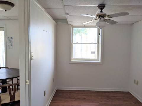 In review of this space, we are thinking that previously the owner moved his mother to this room (from the main room) later in her years so that way she was closer to the bathroom. We removed the ceiling fan, changed the location of the fire alarm, removed some nails, did some wall patching first, and removed stickers from the window (grrrr).