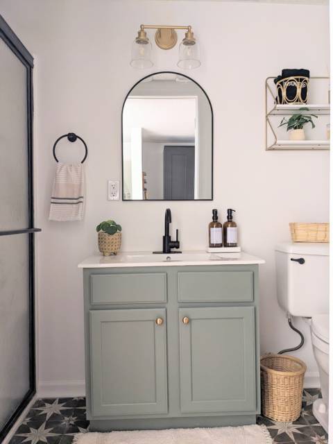The elegant arched mirror , vanity light, and bathroom hardware set/towel hook set were purchased on Amazon. The vanity sits on top of probably my favorite part of the whole bathroom, the tile!! This was the first thing I had picked out to redo this bathroom, it's just so fun and bold!