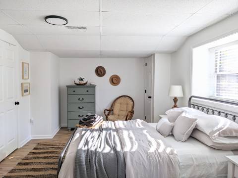 After some paint and new laminate flooring, we switched out the outlets and hardware throughout the room, replaced the lighting, and placed our whole bedroom suit (that was originally our master bedroom) into this space. It's extra exciting because we have been able to upgrade the furniture upstairs now for ourselves! I found the beautiful rattan chair from Facebook marketplace for a great deal! It definately completed the space, plus everyone needs a comfy spot to put their shoes on right? ;)