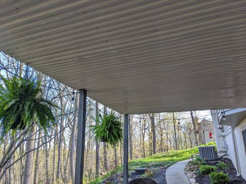 I think alongside of the bathroom, this came 2nd in line as far as how much work was put into it for completing the Airbnb! We tore down an old wooden arch, pressure washed the exterior wall and patio then painted it, added an under decking roof, replaced some lights, and fixated the landscaping.