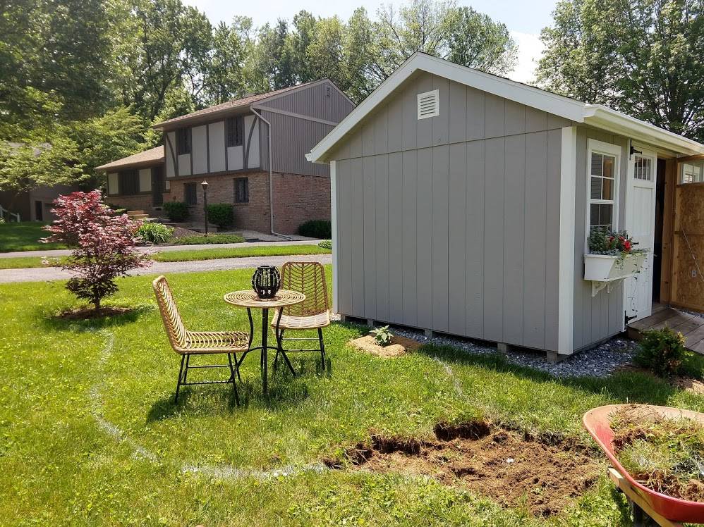 As much as I want a little greenhouse attached to our shed, it was best that we didn't add one because it would have taken up too much space. Some of you may be saying/thinking there are multiple sizes, that we could get away with a small one. Well, I wanted one that I could stand, walk around in, have a potting table at one end and a cozy seating area at the other with string lights above... so pretty big! So instead, why not take away the greenhouse idea and instead add a seating area surrounded by a pretty flower bed?!